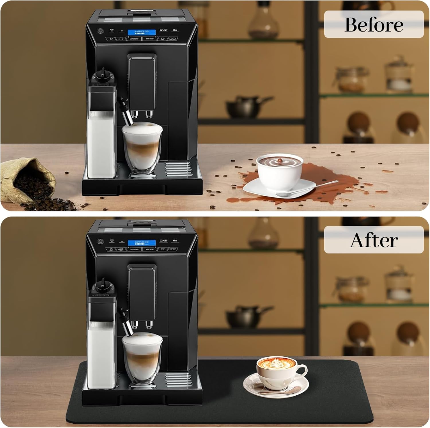 - 【Coffee Maker Mat For Countertops】Keep your coffee maker and countertops clean from spills with a coffee mat. This coffee bar mat protects your kitchen countertop surfaces from coffee splashes or coffee bean stains and can avoid the trouble of cleaning the countertops.