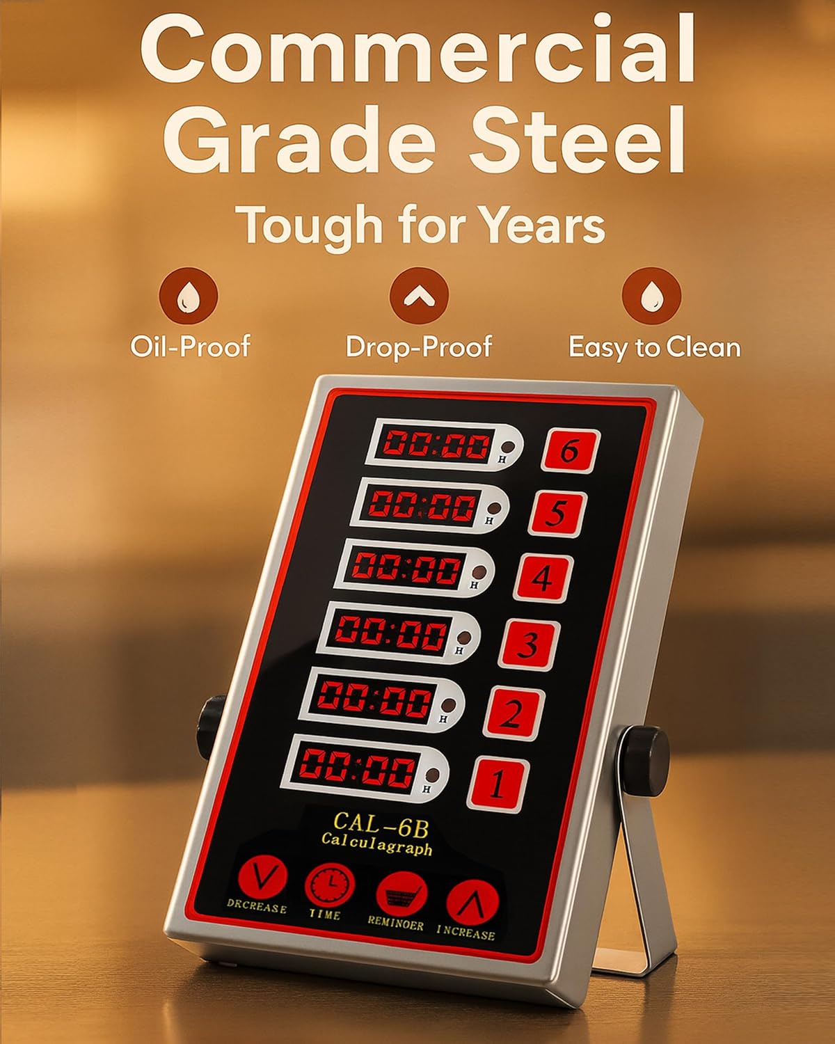 - Designed for Commercial Kitchens: 6 independent timing channels let you track multiple stations at once (fryer, oven, prep). Set from 00:00–99:59 and switch between HH:MM or MM:SS to match recipes and workflows.