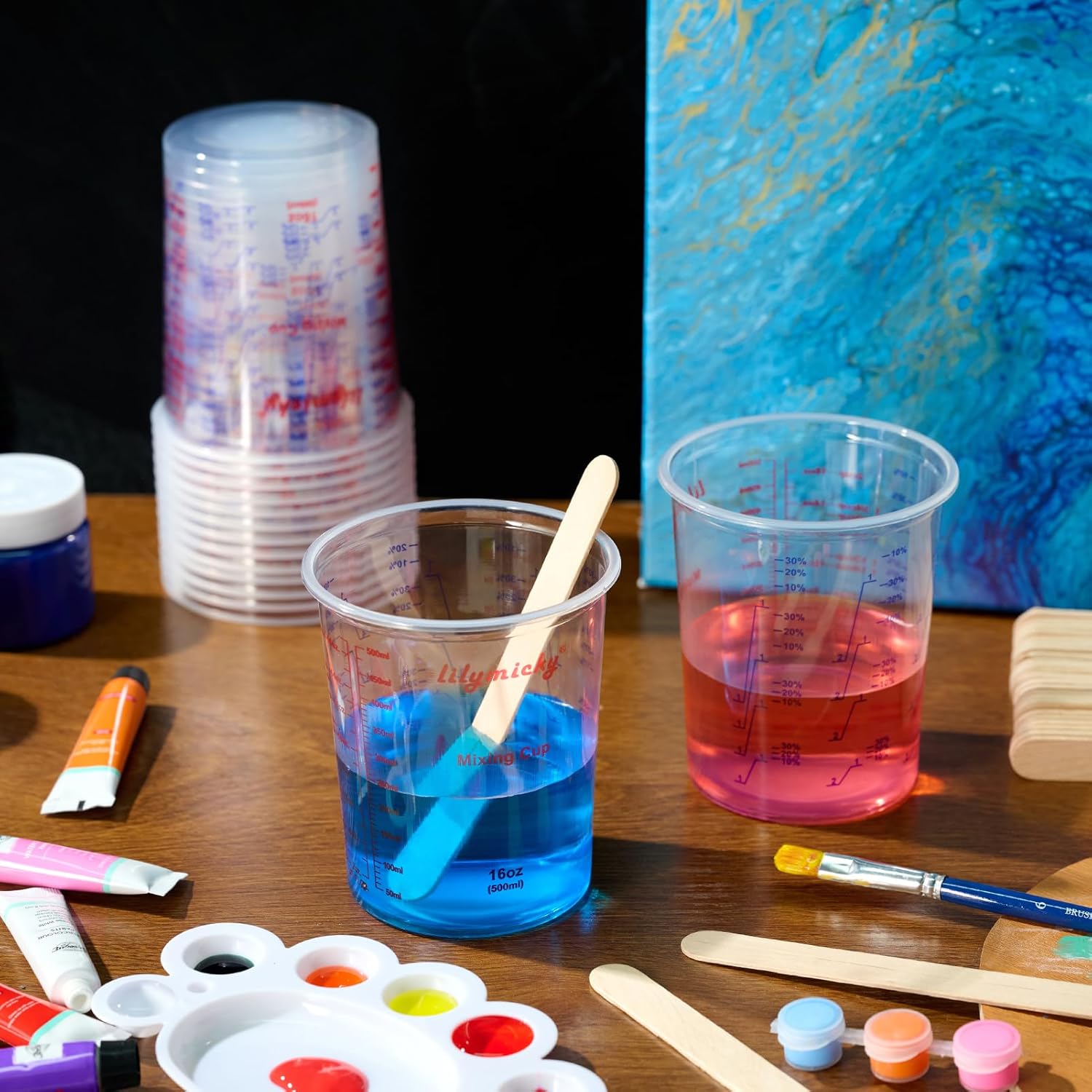 - Multi-use: 16 oz plastic mixing cups, paired with extra-sturdy sticks, perfect for mixing paints, pigments, epoxies, alcohol inks, etc. Also can be used in DIY creations, painting projects and scientific experiments