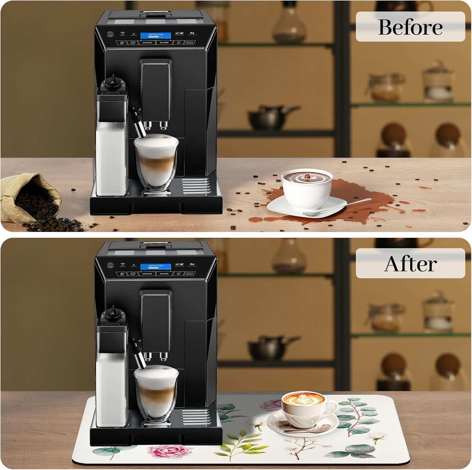 - 【Coffee Maker Mat For Countertops】Keep your coffee maker and countertops clean from spills with a coffee mat. This coffee bar mat protects your kitchen countertop surfaces from coffee splashes or coffee bean stains and can avoid the trouble of cleaning the countertops.