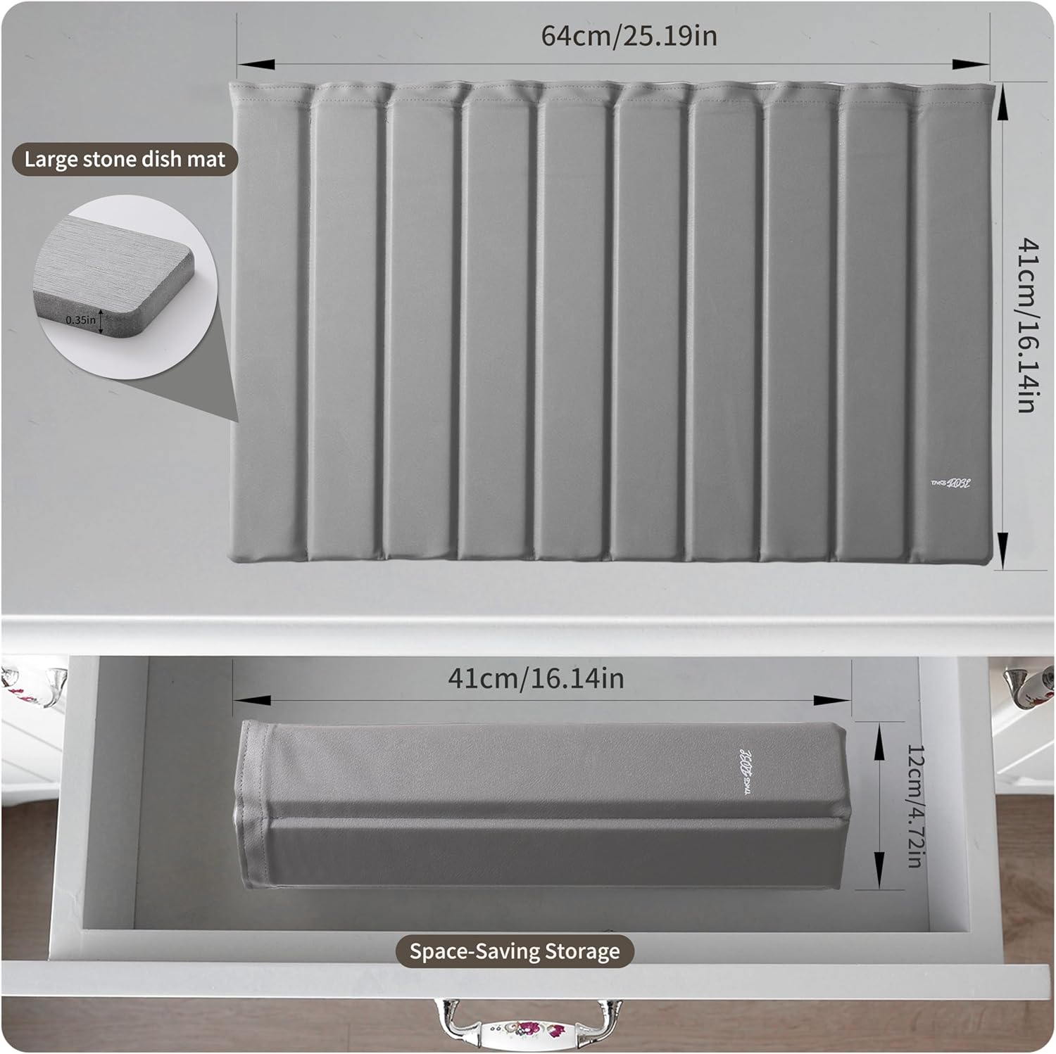 - 【FOLDABLE STONE DISH DRYING MAT】This 24"×16" stone drying mat fits dishes, pans, and more. Easily folded or rolled for compact storage. Remove the diatomaceous earth strips or fold to fit any kitchen space.