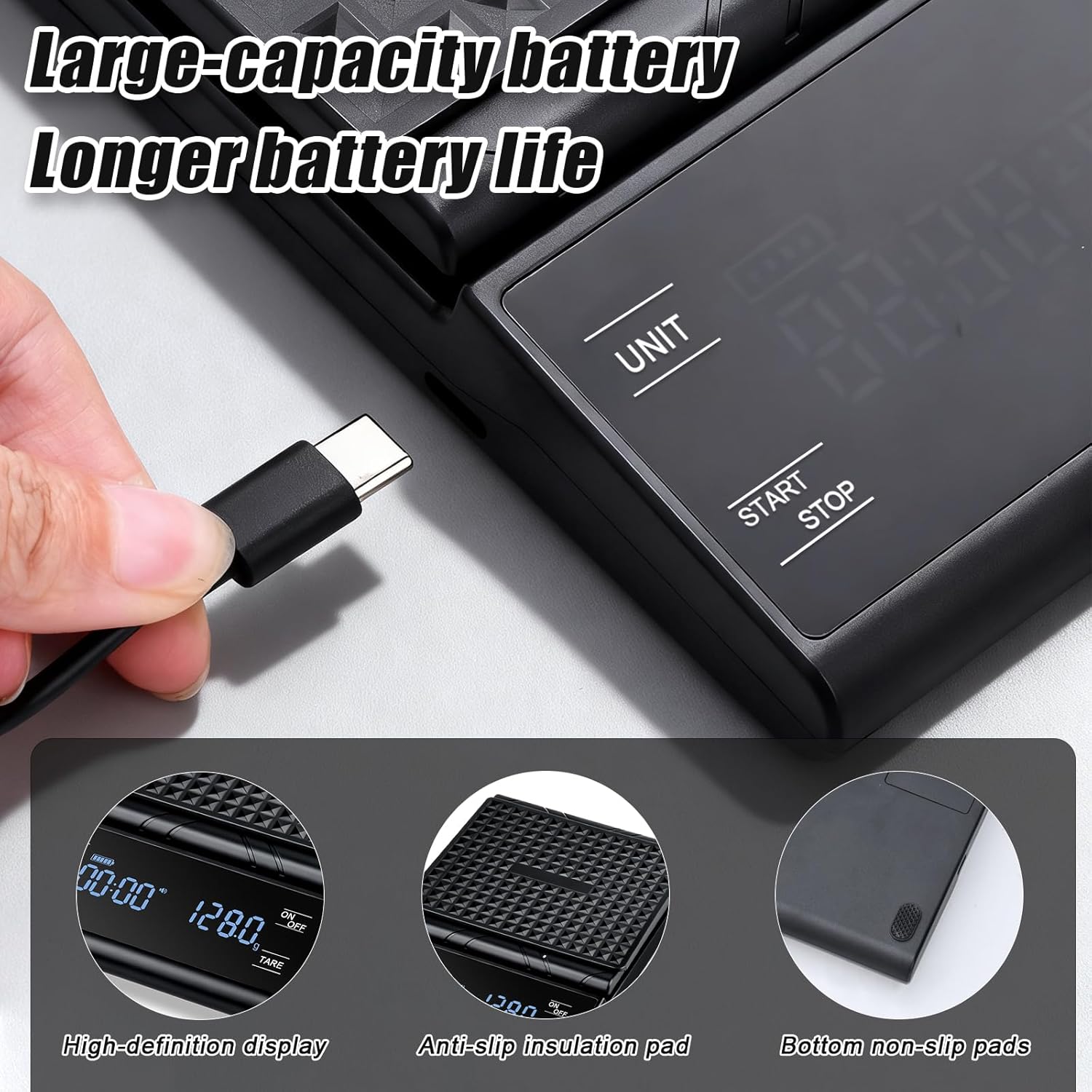 - 【Long Standby Time】This high precision coffee drip scale is available in both rechargeable and battery-powered models, with a built-in 500 mAh lithium battery or a USB-C charging cable. The built-in timer of espresso scale ensures consistent coffee quality in every cup. If you have any questions about our coffee scale with timer, please feel free to contact us. I'm sure you'll love our coffee scale espresso
