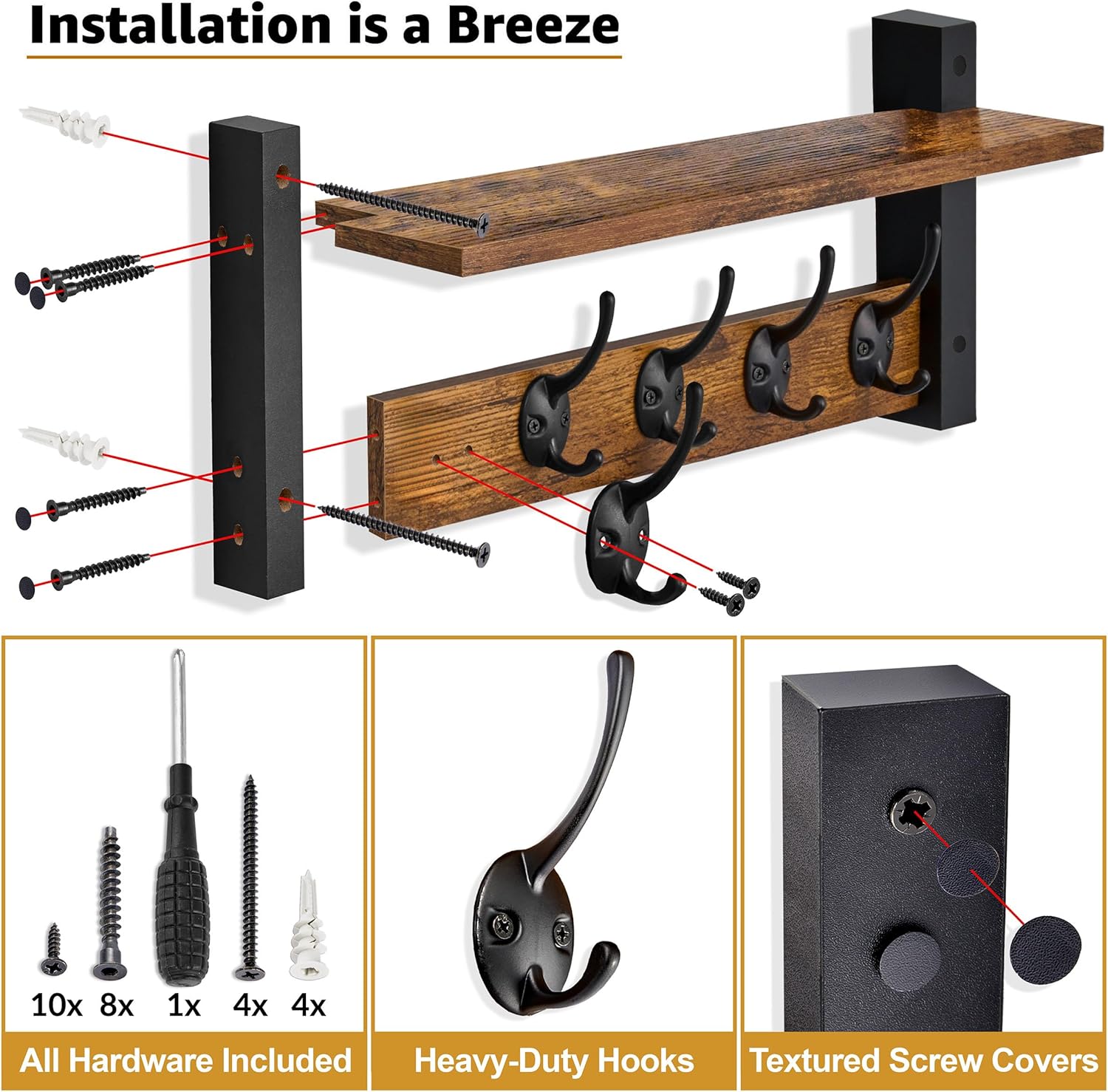 Sorbus Coat Hooks Wall Mount with Shelf – 16 Inch Coat Rack Wall Mount with 5 Heavy Duty Hooks – Floating Wall Shelf with Hooks for Entryway, Bathroom, Bedroom, Kitchen, or Mudroom (Rustic Brown)