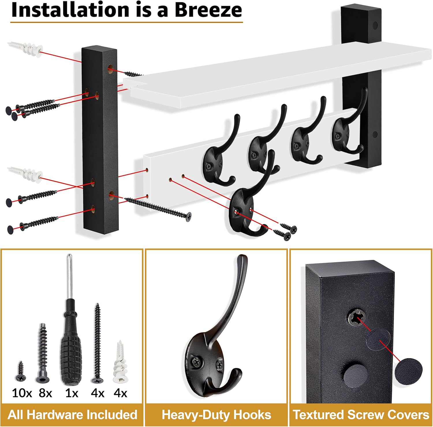 - Easy Installation, All Hardware Included – Labeled parts and step-by-step instructions make installation a breeze. Comes with screws, drywall anchors, mini level, screwdriver, and textured screw covering stickers for a clean finish. Measures approximately 15.75 L x 7.5 W x 4.7 D.
