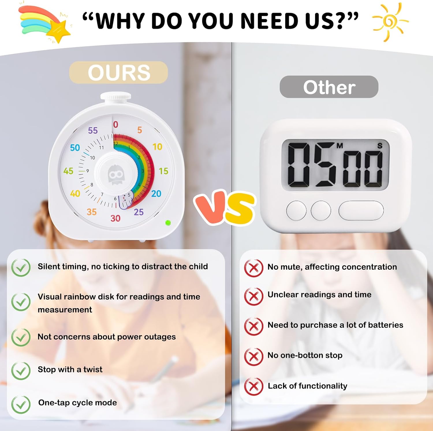 - 🕒 Rainbow Visual Timer for Kids & Adults – Rainbow pattern design stimulates children's interestand. Watch time pass with vibrant rainbow segments! Easy-to-read countdown (60min or 12h) helps kids and ADHD users manage tasks visually.