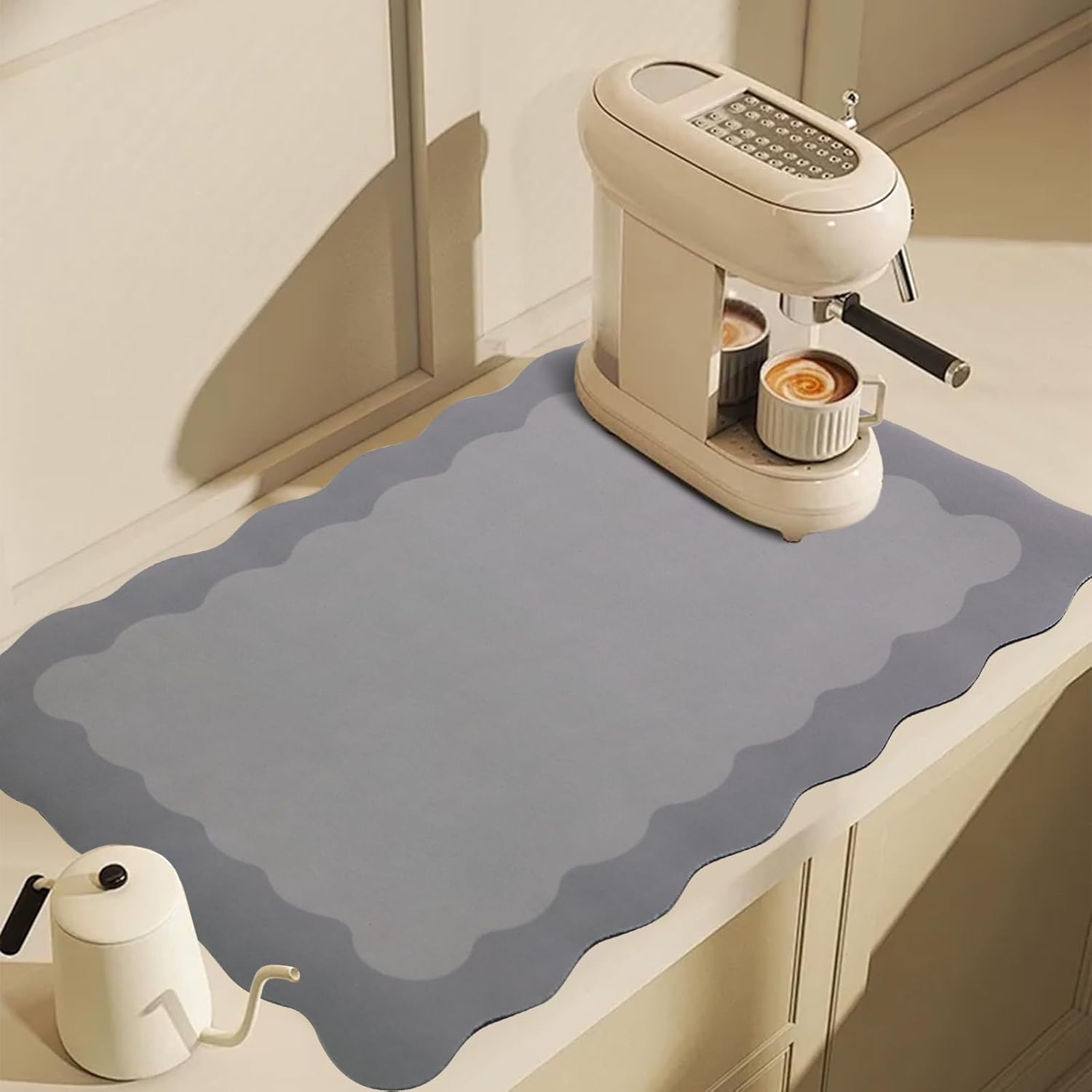 Scalloped Coffee Bar Mat for Countertop, Cute Dish Drying Mats for Kitchen Counter, Diatomite Absorbent Mat for Coffee Station, Kitchen Aesthetic Decor (16"x24", Grey)