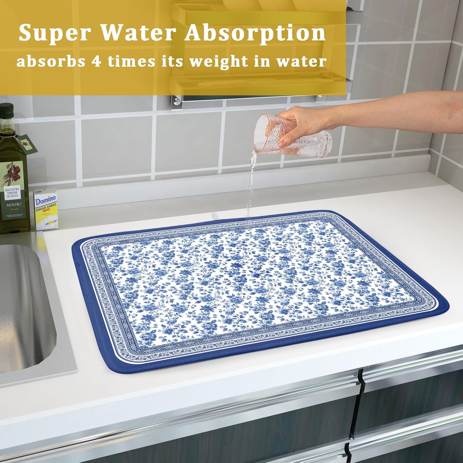- 【Premium Material】The blue white oriental floral drying mat is made of high-quality polyester surface material, and the middle is composite sponge material, provides a soft protective cushion. The backing with reversible superfine fiber can absorb water several times heavier than itself, which quickly absorbs water, stops liquids from soaking through, keep the kitchen countertop dry and clean. The dish drying mat can been double-sided uses with strong edging, not easy to disperse.