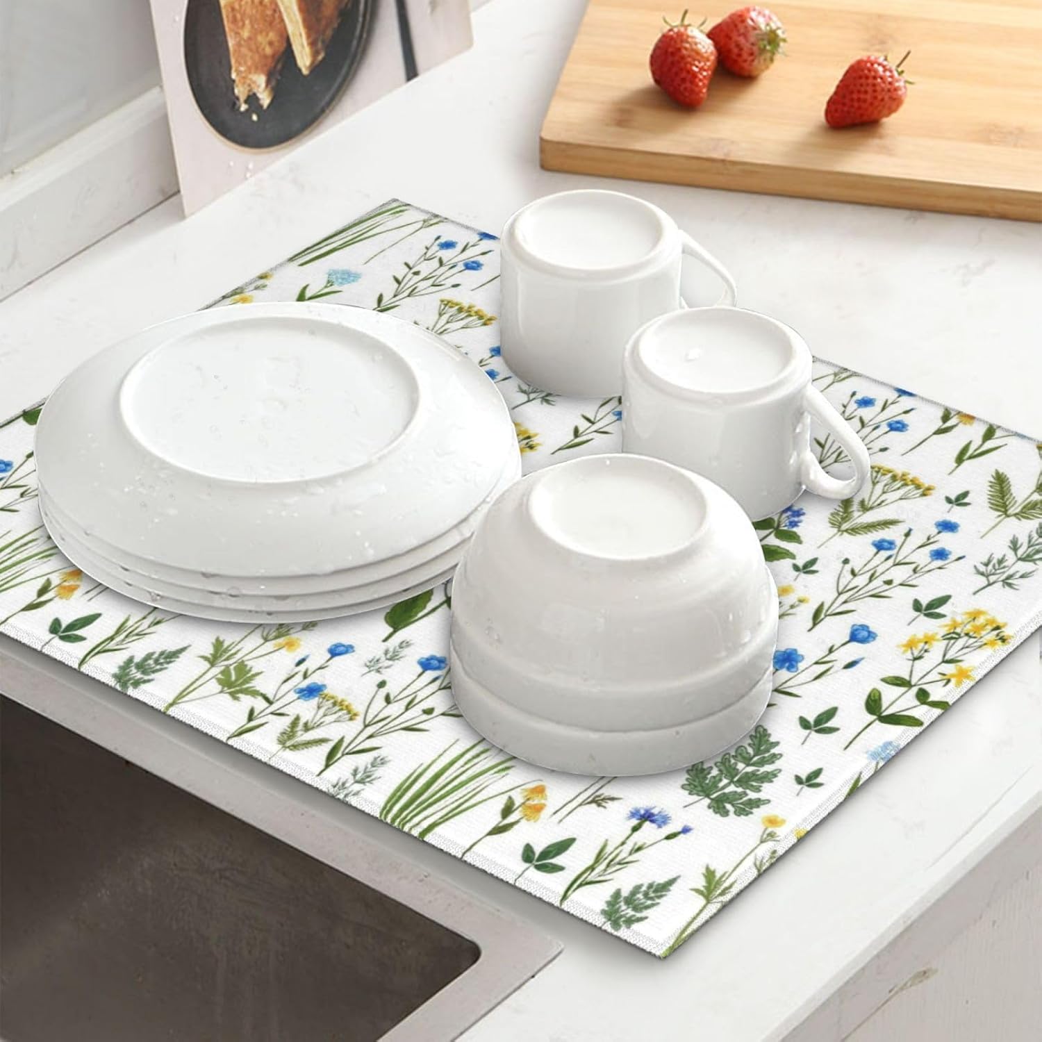Blue Yellow Wildflower Dish Drying Mats for Kitchen Counter, Vintage Botanic Fern Leaves Floral Kitchen Drainer Pad, Absorbent Microfiber Reusable Washable Dish Draining Mats, Home Decor, 16 x 18 inch
